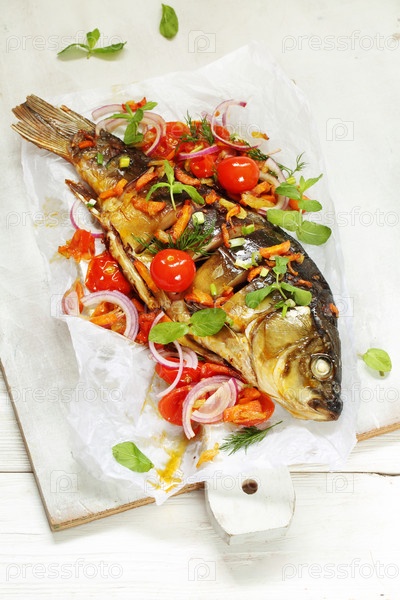 Жареный карп с овощами и белым вином