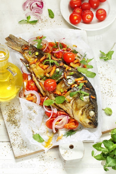 Жареный карп с овощами и белым вином