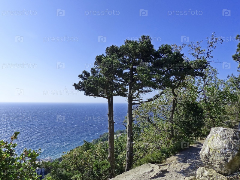 Вид на море с Солнечной (Царской) тропы. В некоторых местах тропа проходит вдоль скал. Прогулки по этому пути не утомительны. Протяженность в одном направлении составляет 6711 метров. Южный берег Крыма