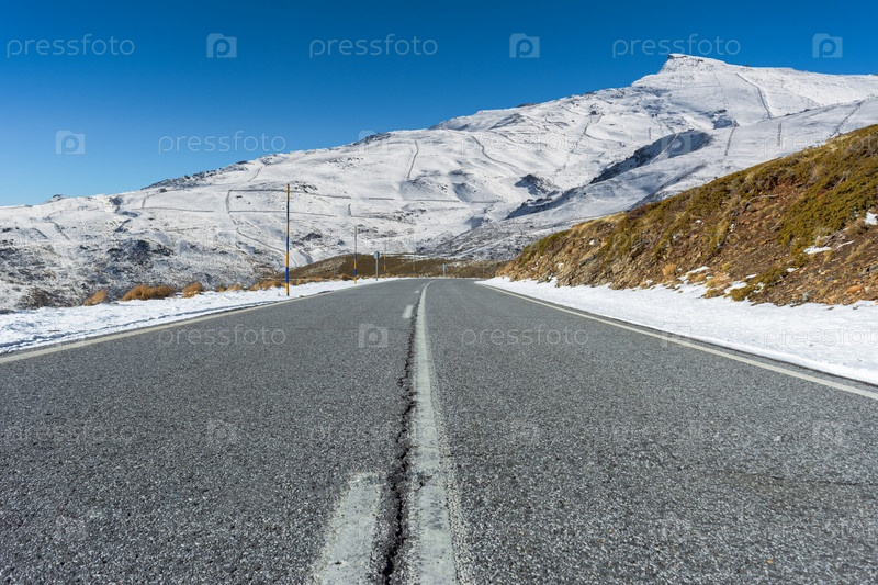 Пустая дорога к заснеженным горам Сьерра-Невада. Гранада, Испания
