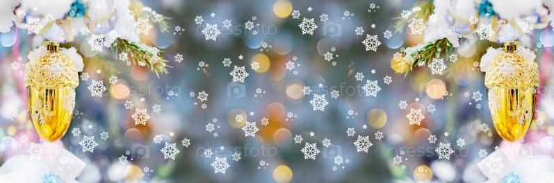 Рождественский расфокусированный широкоэкранный фон боке с украшенными еловыми ветками и снежинками. Новогодний зимний арт-дизайн, баннер