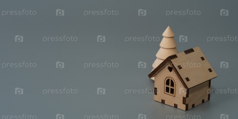 Небольшой деревянный дом на сером фоне. Концепция поиска дома. Оценка дома. Оценка имущества. Выбор места для строительства. Поиск жилья, квартир. Баннер