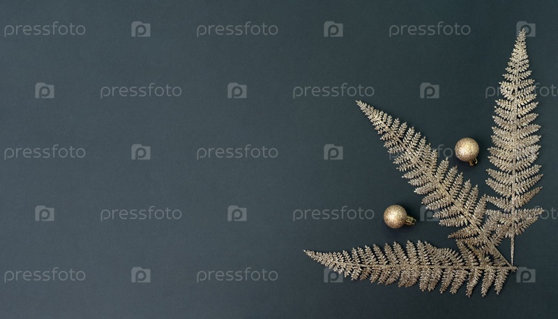 Рождественские золотые украшения на сером фоне. копировать пространство, плоская планировка, вид сверху