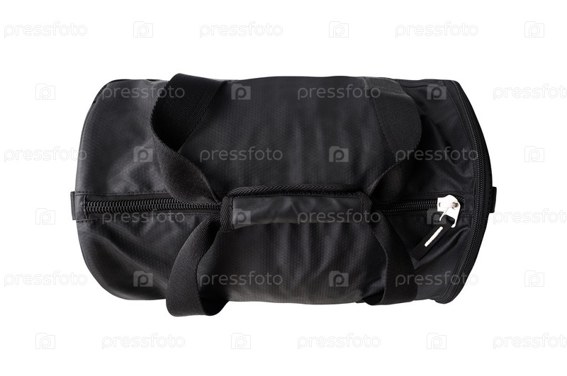 Вид сверху на черную спортивную сумку с застежкой-молнией и ручками, изолированными на белом