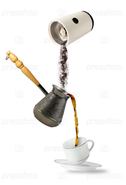 Молотый кофе падает с электрической кофемолки, а напиток течет в чашку