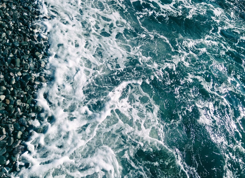 Вид сверху на морскую воду с пеной и рябью на фоне гравийного пляжа