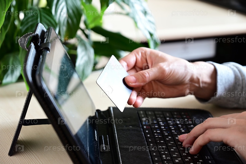 Руки держат кредитную карту и используют ноутбук. Онлайн покупки