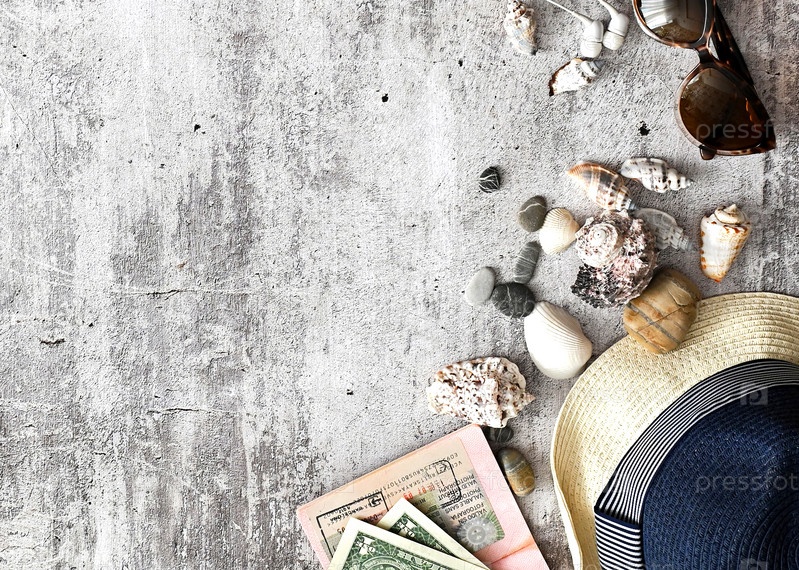 Туристическая одежда на светлом пастельном фоне. Плоская планировка, вид сверху. ВСЕМИРНЫЙ ДЕНЬ ТУРИЗМА