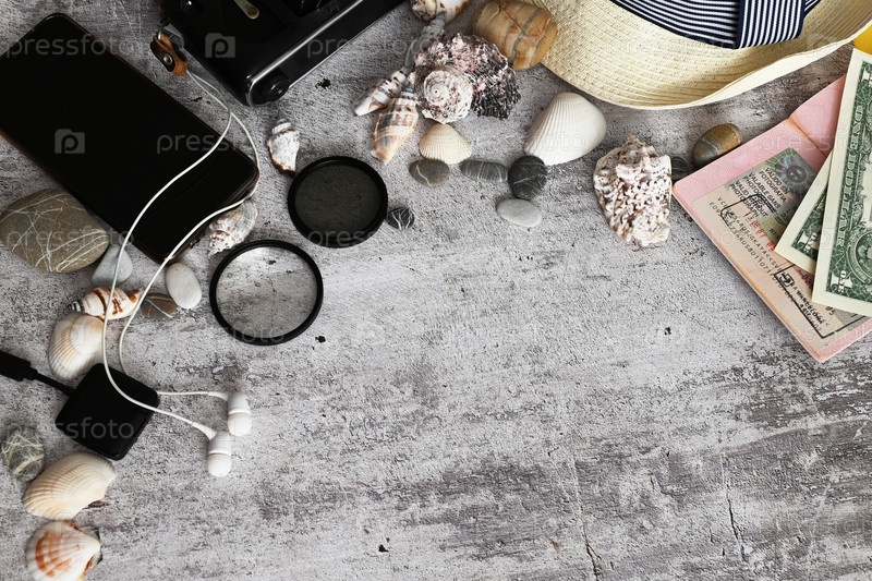 Туристическая одежда на светлом пастельном фоне. Плоская планировка, вид сверху. ВСЕМИРНЫЙ ДЕНЬ ТУРИЗМА