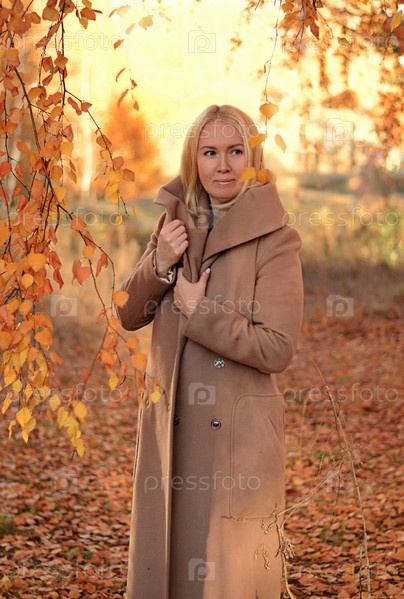 Счастливая женщина в желтом пальто с осенними листьями в руке и осенним желтым садом или парком. Красивая улыбающаяся молодая женщина в осенней листве