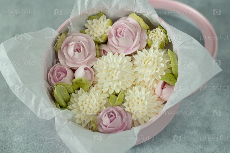 Домашний зефир в подарочной упаковке на светлом фоне, концепция праздника и необычные красивые подарки ручной работы