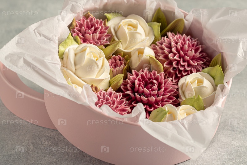 Домашний зефир в подарочной упаковке на светлом фоне, концепция праздника и необычные красивые подарки ручной работы