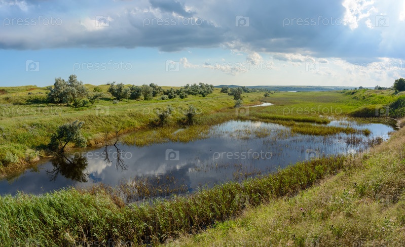 Живописный природный ландшафт небольшого озера, отражающего драматические облака. Летний вечер