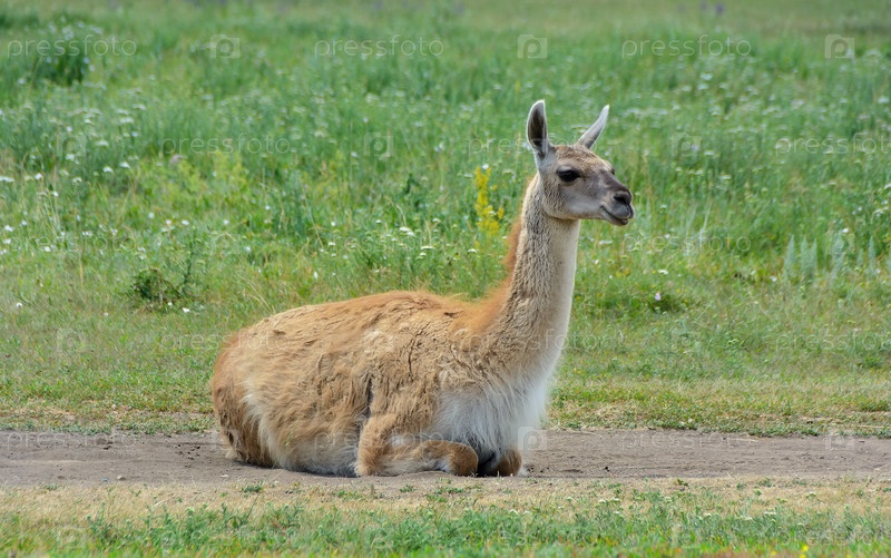 Гуанако Лама гуанико лежит на лугу
