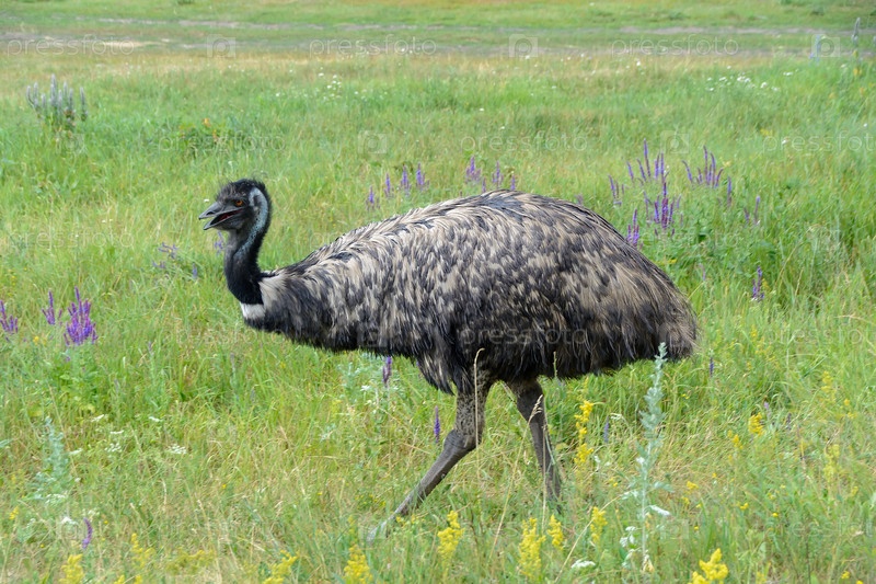Милый страус эму Dromaius novaehollandiae на зеленой лужайке