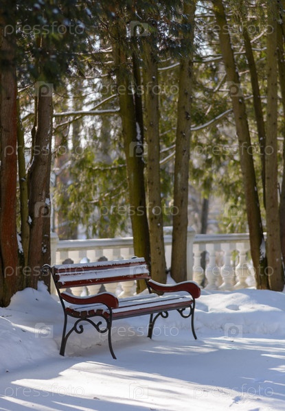 Заснеженная скамейка в парке. Солнечное зимнее утро