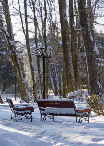 Заснеженные скамейки и старинный уличный фонарь в парке. Солнечное зимнее утро
