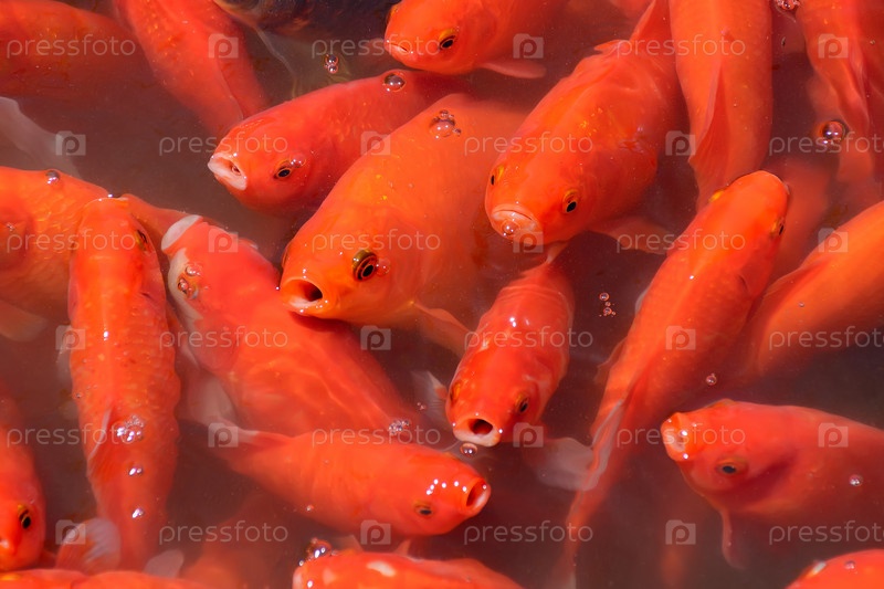 Фон с красной рыбой. Куча золотых карпов японских рыб кои в воде