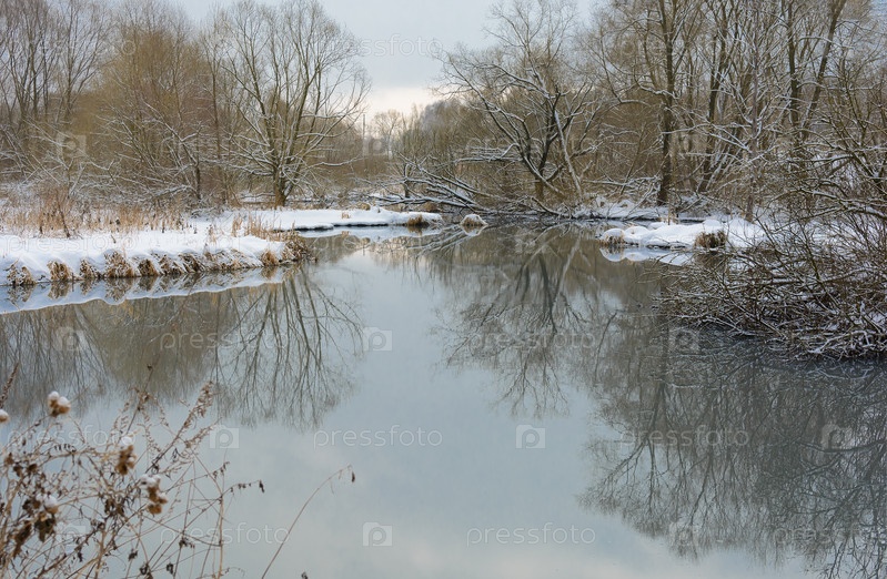 Незамерзшая спокойная река и заснеженные деревья
