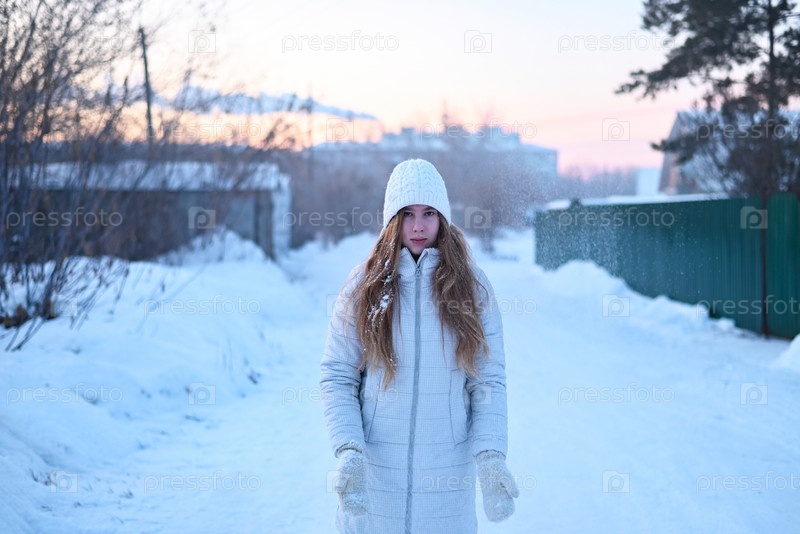 Красивая женщина с длинными волосами в модной зимней одежде (белый пуховик, вязаная стильная шапка, варежки) на улице. Ловля снега. зимняя сказка