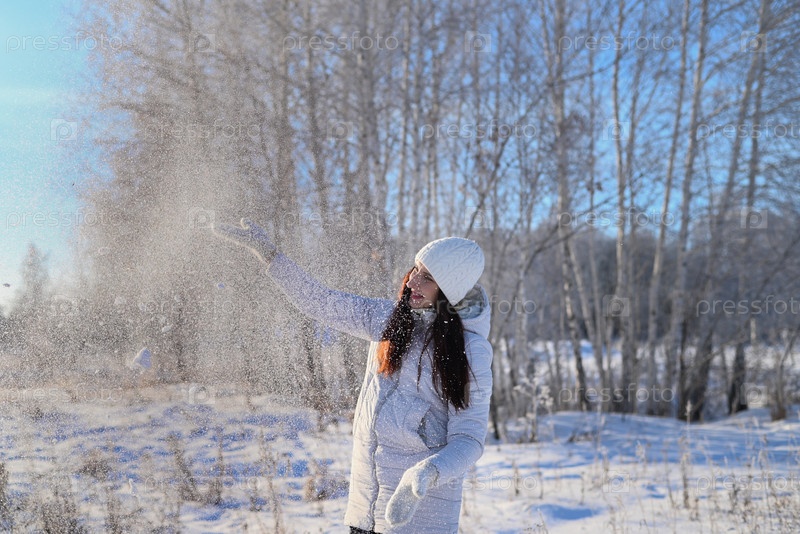 Красивая женщина с длинными волосами в модной зимней одежде (белый пуховик, вязаная стильная шапка, варежки, валенки) на улице. Ловля снега. зимняя сказка