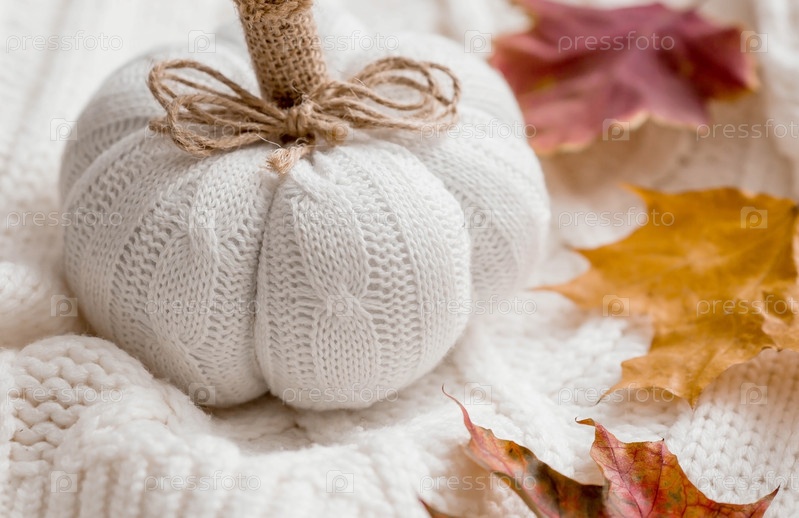 Белая вязаная тыква, осенние листья и белый вязаный плед. Стильная, теплая, уютная осенняя концепция