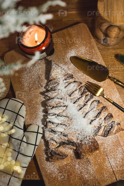 Мягкий фокус. Новогодний стол. Угощения для гостей. Торт из слоеного теста с шоколадом в виде елки на деревянном фоне. Концепция приготовления пищи на праздник
