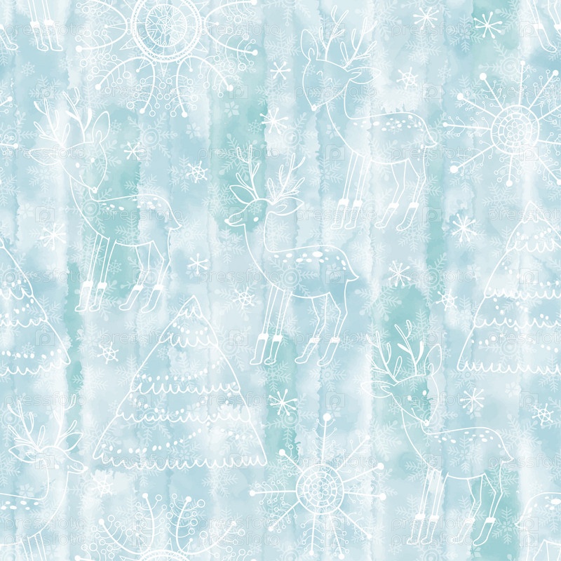 Рождественский бесшовный узор с оленями, елкой, снежинками на синем акварельном фоне. Вектор. Скандинавская зимняя тема. Идеально подходит для шаблонов дизайна, обоев, упаковки, ткани и текстиля