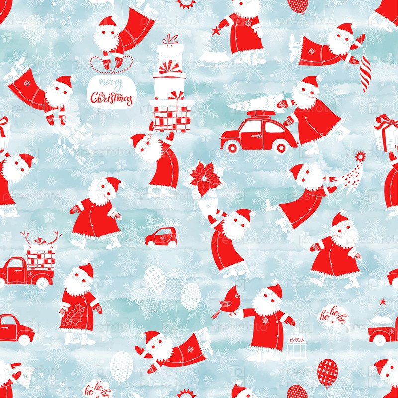 Симпатичные Деды Морозы. Рождественский фон. Мультфильм бесшовный узор на синем акварельном фоне. Идеально подходит для шаблонов оформления обложек, обоев, упаковки и текстиля