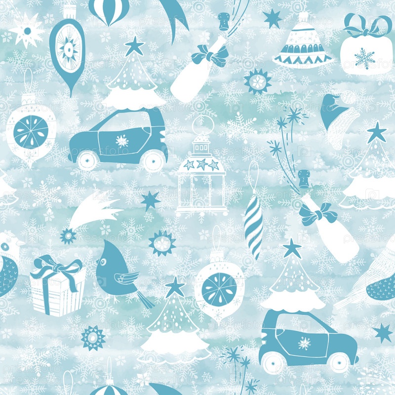 Рождество и Новый год Векторный фон. Бесшовный узор с праздничными элементами на синем акварельном фоне. Идеально подходит для поздравления рождественских и новогодних открыток, приглашений, обоев, упаковки