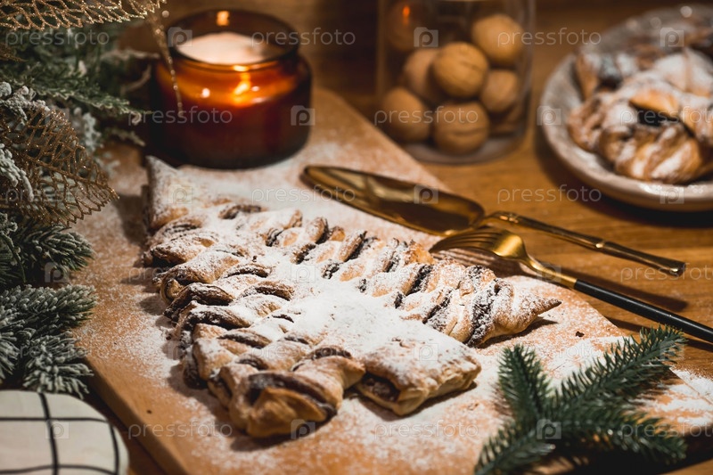 Мягкий фокус. Новогодний стол. Угощения для гостей. Торт из слоеного теста с шоколадом в виде елки на деревянном фоне. Концепция приготовления пищи на праздник