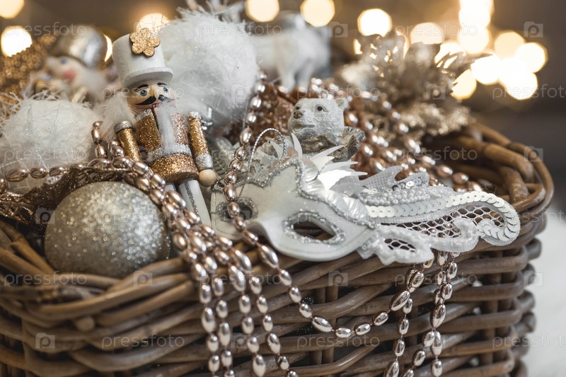 С Новым 2023 годом. Красивый фон с елочными игрушками в плетеной корзине. Празднование зимних рождественских каникул. Концепция начала года и украшение интерьера дома