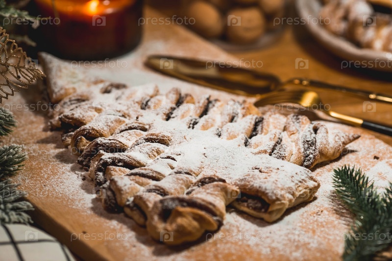 Мягкий фокус. Новогодний стол. Угощения для гостей. Торт из слоеного теста с шоколадом в виде елки на деревянном фоне. Концепция приготовления пищи на праздник