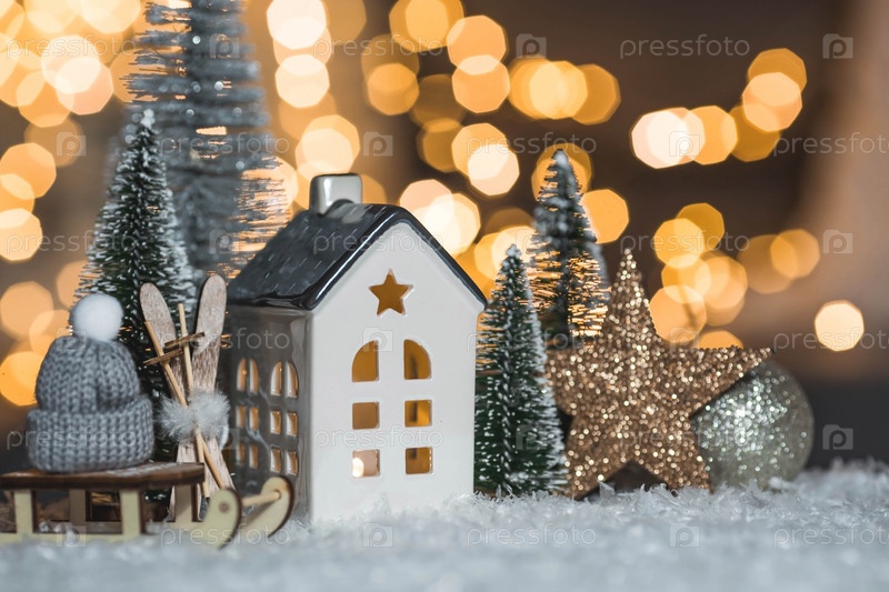 С Новым 2023 годом. Красивый фон с домом, снегом и елками в скандинавском стиле. Празднование зимних рождественских каникул. Концепция начала года