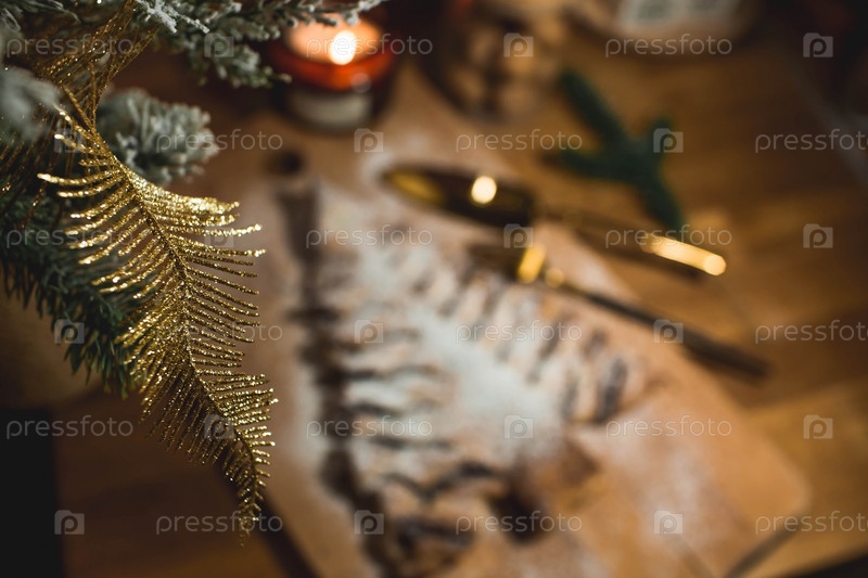 Мягкий фокус. Новогодний стол. Угощения для гостей. Торт из слоеного теста с шоколадом в виде елки на деревянном фоне. Концепция приготовления пищи на праздник