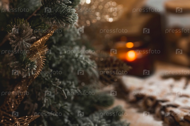Мягкий фокус. Новогодний стол. Угощения для гостей. Торт из слоеного теста с шоколадом в виде елки на деревянном фоне. Концепция приготовления пищи на праздник
