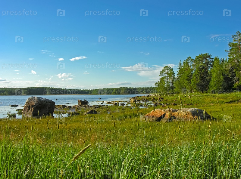 Берег Белого моря, остров Горелый, Керетская губа, Кандалакшкий залив, Карелия. Солнечный день в июле