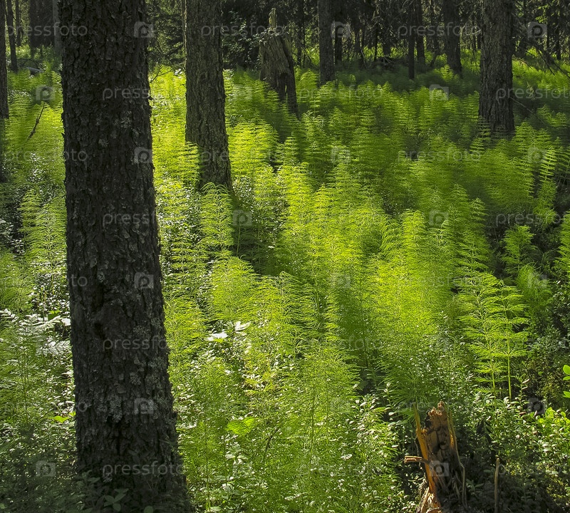 Лесной хвост (лат. Equisetum sylvaticum) в северном лесу Беломорское побережье, Карелия Солнечный день в июле