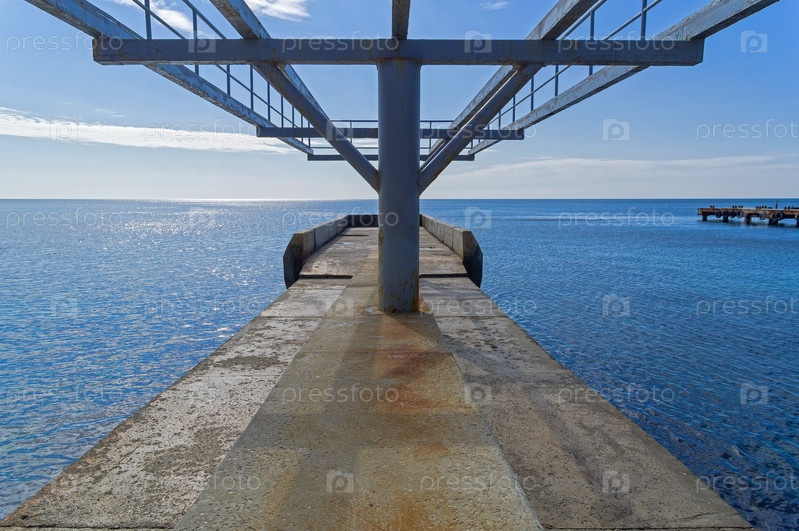 Взгляд в сторону морского горизонта вдоль буны. Черное море, Крым, солнечно