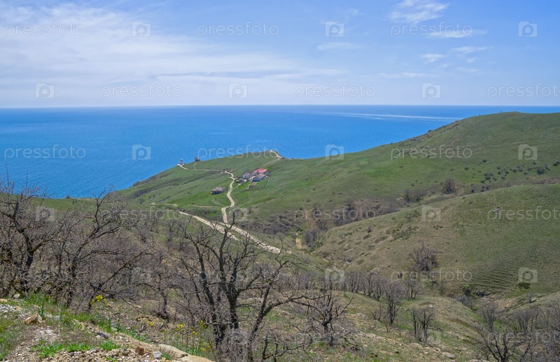 Панорама мыса Меганом - вид на склон, спускающийся к маяку. Крым, солнечный день в апреле
