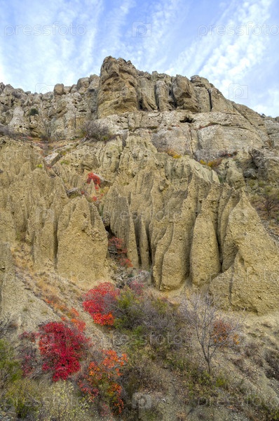 Причудливые глиняные фигуры, образовавшиеся в результате эрозии почвы и выветривания на склоне мыса Меганом. Крым, облачный, день в октябре