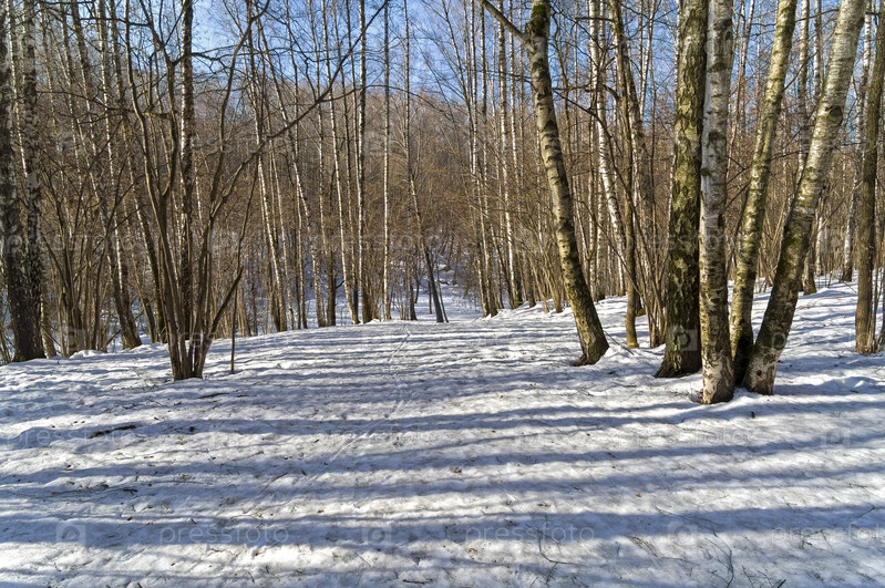Весенний лес, склон небольшого оврага. Теплостановский лесопарк, поздняя весна, солнечный день в конце марта