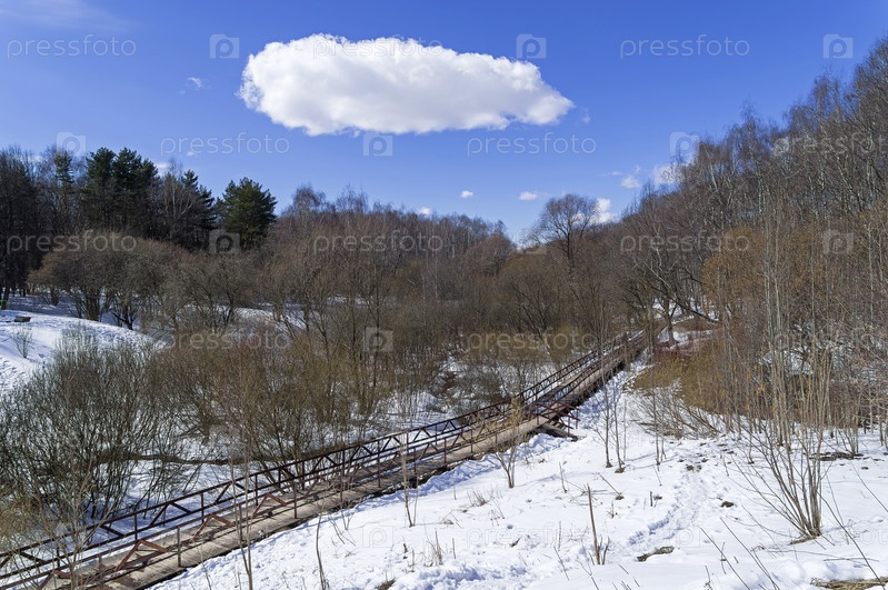 Деревянный пешеходный мостик на дне небольшого оврага. Теплостановский лесопарк, Москва, солнечный день в начале апреля