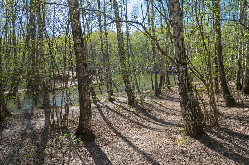 Солнечный день в майском лесу на берегу пруда. Теплостановский лесопарк, Москва
