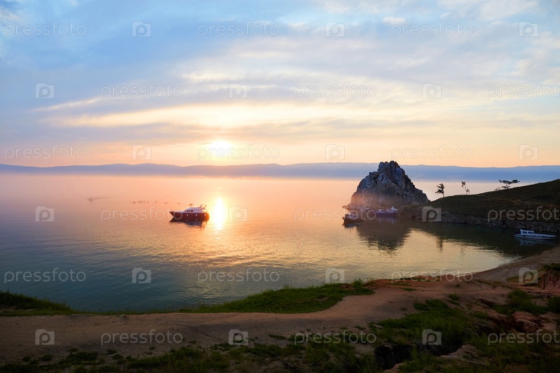 Озеро Байкал, остров Ольхон летним вечером. Вид на Шаманскую скалу