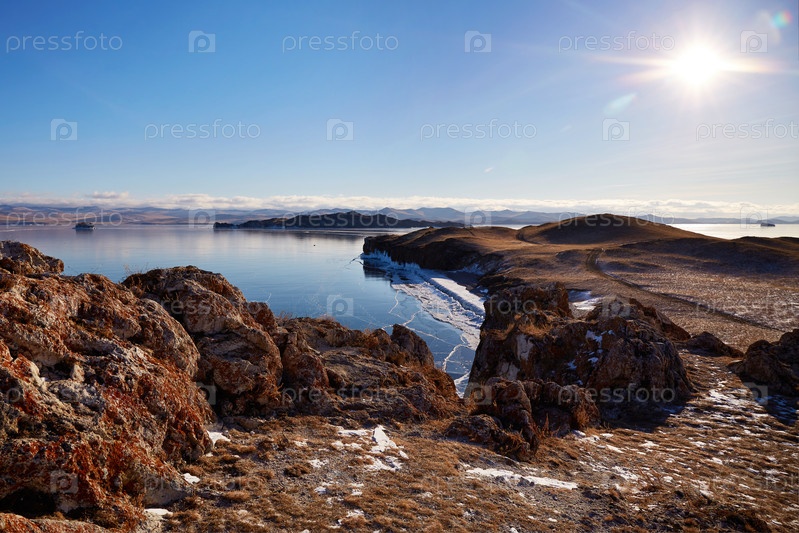 Зимний пейзаж. Замерзшее озеро Байкал в солнечный январский день