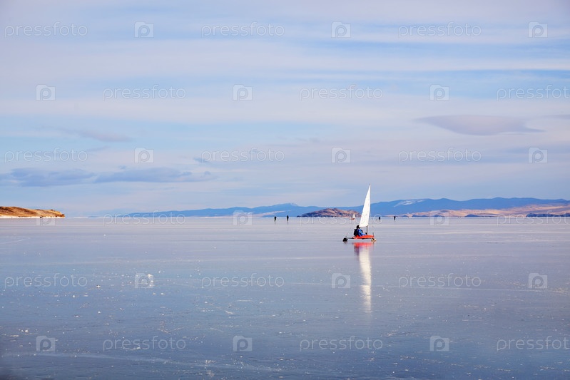Замерзшее озеро Байкал. Спортсмен движется по льду озера на ледяной лодке