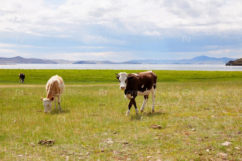 Коровы пасутся на лугу у озера в пасмурный летний день