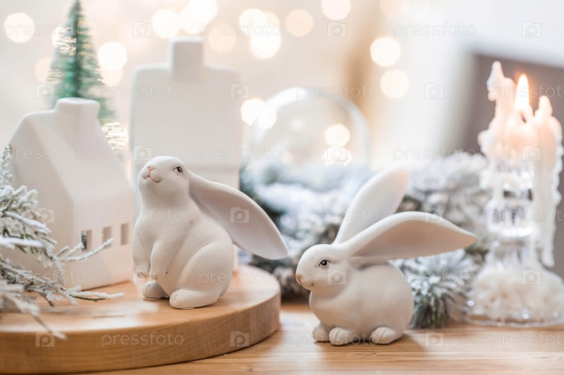 Рождественские елки, белый кролик и скандинавские белые домики на деревянном столе в уютной гостиной. Стильная новогодняя открытка в скандинавском стиле