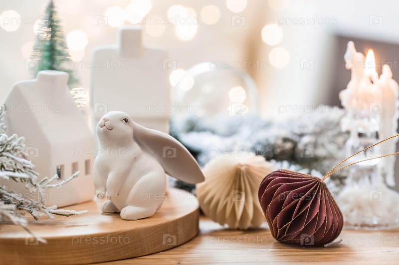 Рождественские елки, белый кролик и скандинавские белые домики на деревянном столе в уютной гостиной. Стильная новогодняя открытка в скандинавском стиле